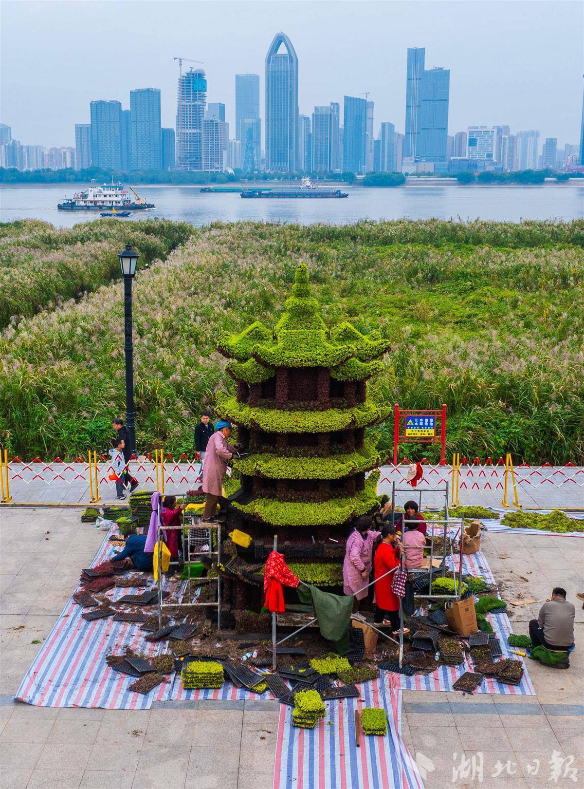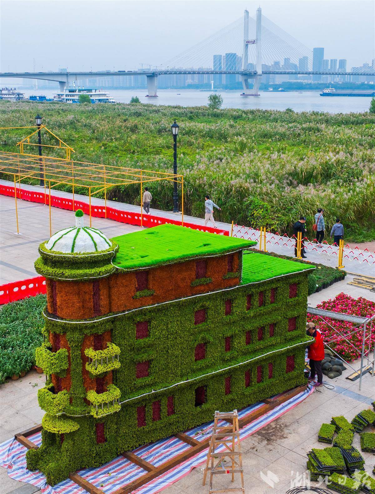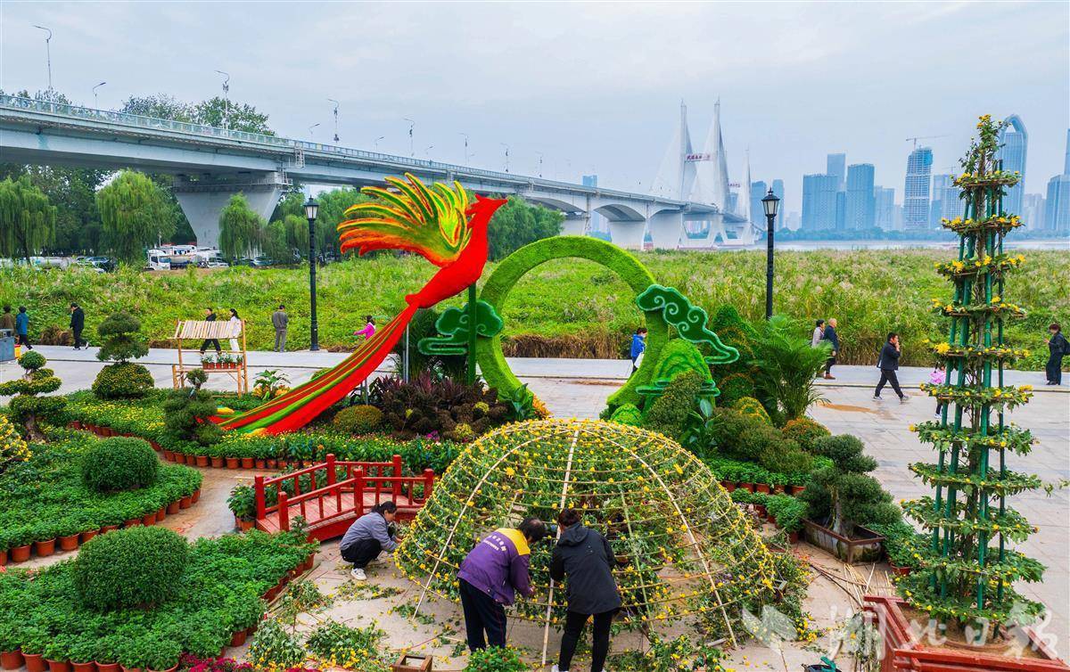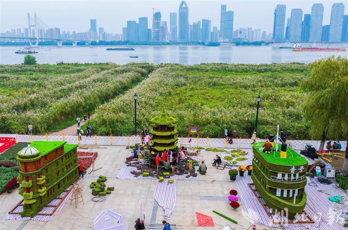 10月26日,武汉汉口江滩,园林工人正紧锣密鼓地推进武汉第42届金秋菊展布展工作。现场,黄鹤楼、巴公房子等融合城市地标元素的菊花造型已初露真容,各色菊苗被精心摆放、修剪,勾勒出灵动别致的景观雏形。本届金秋菊展以“金菊璀璨映江城 百姓园林绘新篇”为主题,将于11月1日至11月30日举行。(湖北日报全媒记者 薛婷 摄)